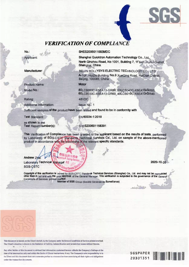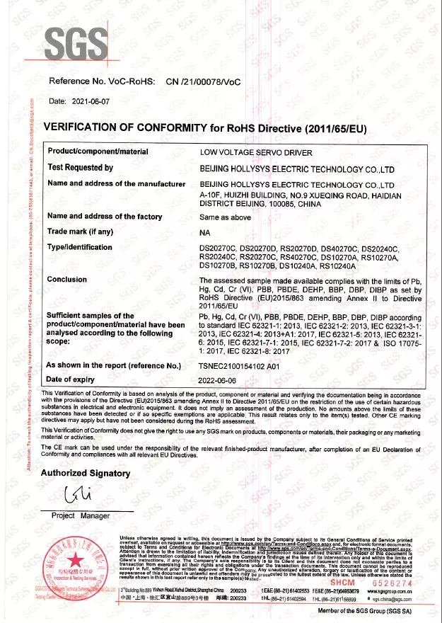SGS是全球領(lǐng)先的檢驗(yàn)、鑒定、測(cè)試和認(rèn)證機(jī)構(gòu),是全球公認(rèn)的質(zhì)量和誠(chéng)信基準(zhǔn)。SGS作為國(guó)際權(quán)威認(rèn)證機(jī)構(gòu)為和利時(shí)電機(jī)產(chǎn)品頒發(fā)CE證書(shū)和RoHS證書(shū),是對(duì)和利時(shí)電機(jī)技術(shù)實(shí)力的專(zhuān)業(yè)背書(shū),增強(qiáng)了和利時(shí)電機(jī)產(chǎn)品在國(guó)際市場(chǎng)的品牌力,也助力設(shè)備制造商加速全球化步伐。