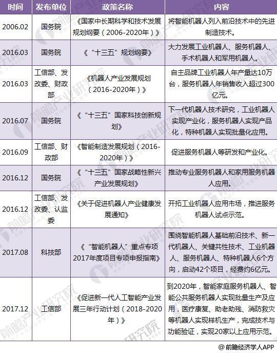 2016年4月,工信部、發改委、財政部聯合印發《機器人產業發展規劃(2016-2020年)》明確,到2020年,自主品牌工業機器人年產量達到10萬臺,六軸及以上工業機器人年產量達到5萬臺以上。服務機器人年銷售收入超過300億元,在助老助殘、醫療康復等領域實現小批量生產及應用。培育3家以上具有國際競爭力的龍頭企業,打造5個以上機器人配套產業集群。
