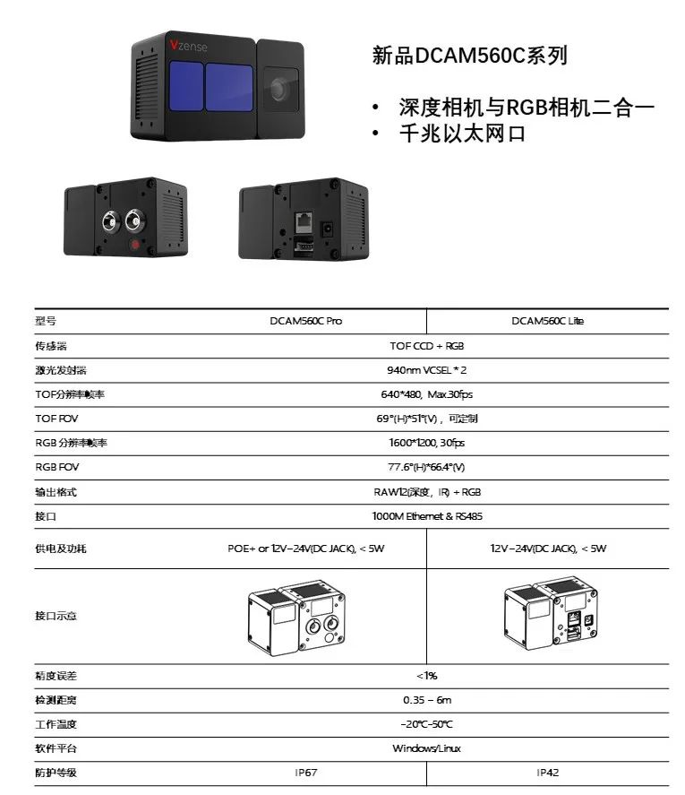 DCAM560C產品系列集成了團隊近年來的研究成果,將2D RGB圖像與3D ToF面陣相機技術相結合,輸出在時間和空間上重合的RGB和3D圖像,每個像素都參與測距,不僅可以在獲取XY軸方向圖像的基礎上還能獲取Z軸方向上的距離信息,從而獲得高精度的深度圖,實現“三次元空間的感知能力”,用以滿足工業級客戶不同的使用場景,適用于工業自動化,智能物流,智慧駕駛,智能安防,3D建模等需要3D感知物體與環境、構建3D模型并進行分析的領域。