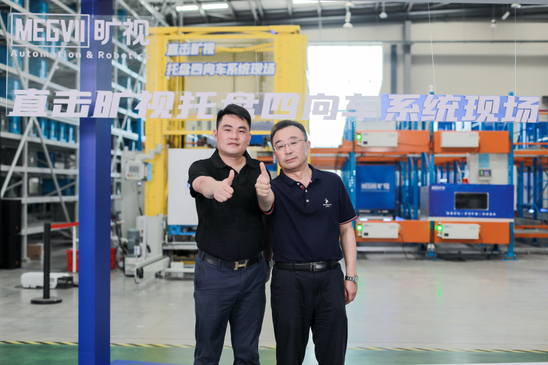 紫宸科技溧陽公司總經理南明哲(右)與曠視物流業(yè)務事業(yè)部產品業(yè)務負責人程昌順(左)在曠視四向車系統(tǒng)直播現(xiàn)場