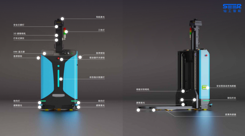 仙工智能 SRC 系列核心控制器打造的激光 SLAM 智能叉車整車實現(xiàn)多種傳感器的超高配置,360° 立體安全防護(hù),提升了 AMR 運行過程中的安全等級,包括:導(dǎo)航激光、前后避障激光、安全觸邊、距離傳感器、急停按鈕、3D 避障相機(jī)等。