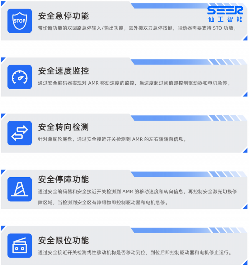 仙工智能以智能控制器和數(shù)字化軟件為核心的產(chǎn)品組合中,將安全作為第一要義,從產(chǎn)品研發(fā)到產(chǎn)品測試到最終交付,始終貫徹安全守護(hù)課題,為客戶打造更安全的 AMR。