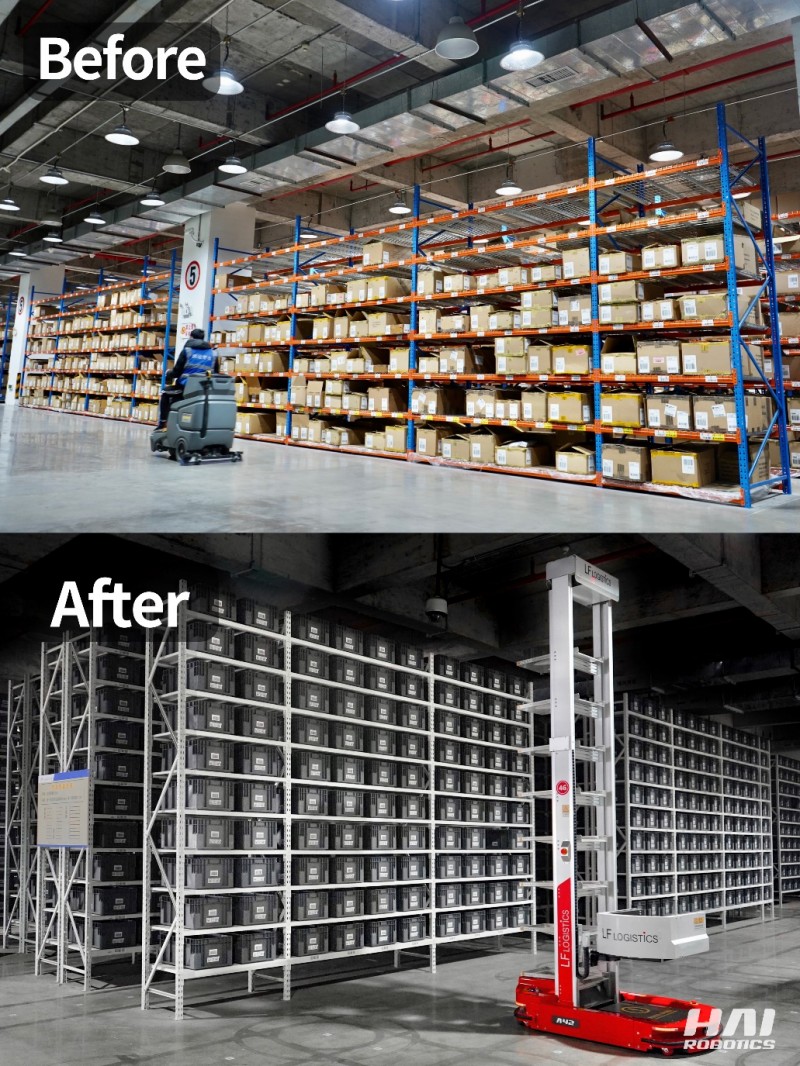 針對利豐供應(yīng)鏈倉庫存儲密度低,存儲壓力大的痛點(diǎn),海柔創(chuàng)新部署HAIPICK A42箱式倉儲機(jī)器人搭配立體貨架的組合存儲方式,其中立體貨架高度可高達(dá)4.3米。此外,由于ACR的產(chǎn)品設(shè)計(jì)理念是貨箱到人,對比潛伏式移動機(jī)器人機(jī)身設(shè)計(jì)更窄,使得貨架之間的巷道面積得以進(jìn)一步縮小,從而提升存儲密度。改造后的前海