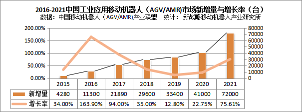 工業應用移動機器人(AGV/AMR)不僅能提高制造工廠的生產效率,更能大大降低用工風險。這也是我國強力深入推行《中國制造2025》和“十四五規劃”戰略部署的重要原因,根據中國移動機器人(AGV/AMR)產業聯盟數據、新戰略移動機器人產業研究所統計,從2016年至2021年,中國市場工業應用移動機器人(AGV/AMR)產業年復合增長率約46%,尤其是2021年度全球新冠疫情的大規模影響之下,同比增長高達64%,遠遠超過絕大部分行業增長速度。
