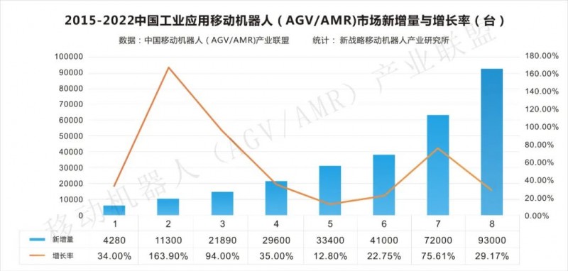 根據CMR產業聯盟數據,新戰略移動機器人產業研究所統計,2022年度,中國工業應用移動機器人(AGV/AMR)銷售數量93000臺(含銷往海外市場),較2021年增長29.17%,市場規模達到185億元,同比增長46.82%。