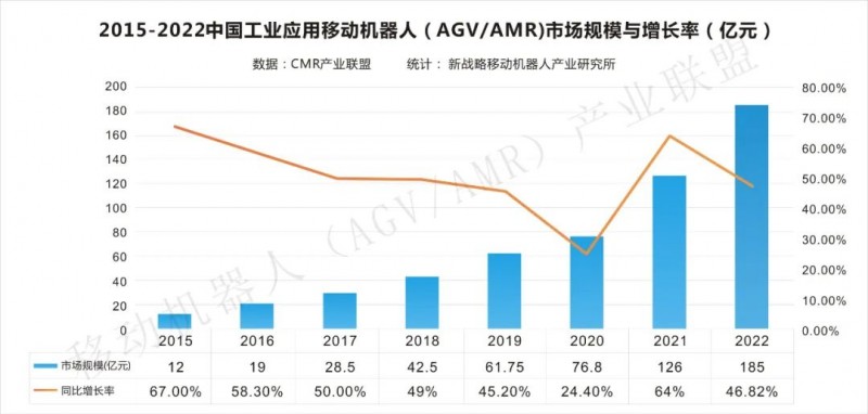 2015-2022中國工業應用移動機器人(AGV/AMR)市場規模與增長率