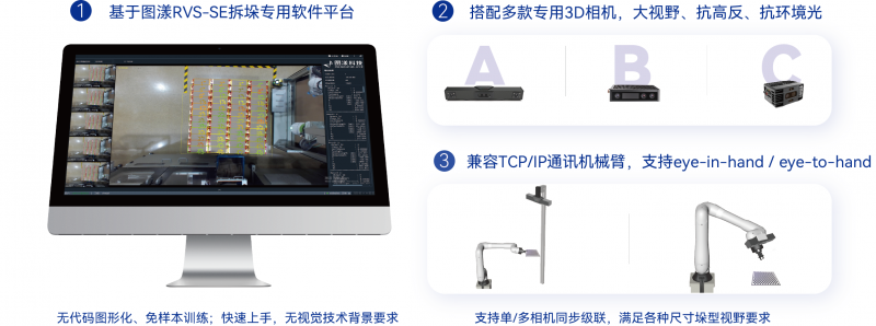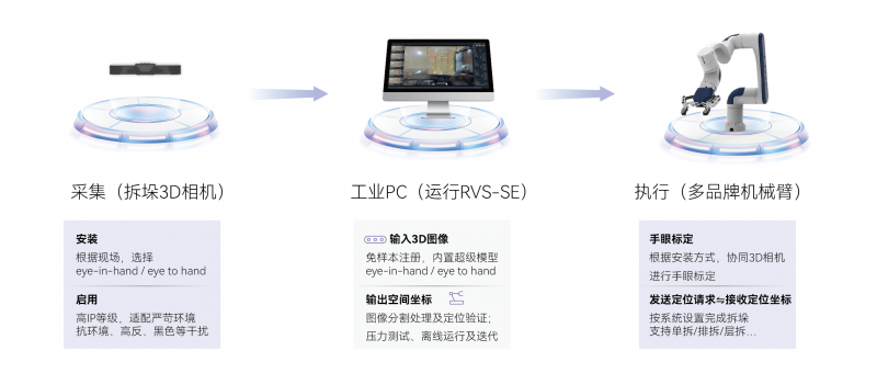RVS-SE標準拆垛方案產品,由RVS-SE軟件和固定搭配的3D工業相機組成,用戶可以自選機械臂和前端執行部件、工控機。