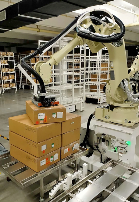 現場了解該客戶產線目前為四款箱型(后續有新增箱型SKU需求),部分箱型有膜覆蓋、膠帶反光等干擾情形,同時廠房布局緊湊,光照復雜,機器人拾取到放置運轉空間小,拆垛系統需具備路徑規劃與碰撞檢測能力;整體效率要滿足客戶需求,銜接連貫。
