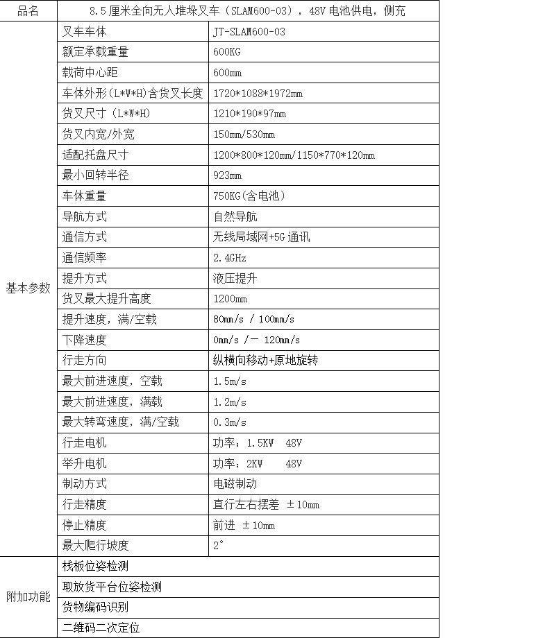 8.5厘米全向無(wú)人堆垛叉車,采用自然導(dǎo)航及二維碼二次定位技術(shù),可縱橫向移動(dòng)及原地旋轉(zhuǎn),全向運(yùn)行;載重600KG;最大舉升高度1200mm;配備嘉騰自主研發(fā)的超低、超窄全向模組,體積小巧、運(yùn)行靈活,支持2M巷道物料搬運(yùn);支持棧板位姿、貨物編碼、貨位狀態(tài)檢測(cè);使用3D 激光雷達(dá)和安全型傳感器全方位避障;配備行車記錄儀和運(yùn)行輪廓警示燈。