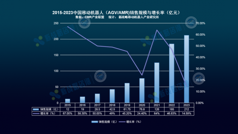 報告內容:全篇8大章節120頁超180張圖表,從不同角度分析當前中國移動機器人市場。包括銷售規模及數量、熱門細分應用領域、熱門細分產品類別、產業鏈各部分剖析、中國市場代表企業、未來發展趨勢等。根據CMR產業聯盟數據,新戰略移動機器人產業研究所統計,從2015年至2023年,中國市場移動機器人(AGV/AMR)產業年復合增長率達43.18% ;2023年中國移動機器人(AGV/AMR)銷售規模約為212億,同比增長14.59%;銷售數量約為125000臺,同比增長34.41%。