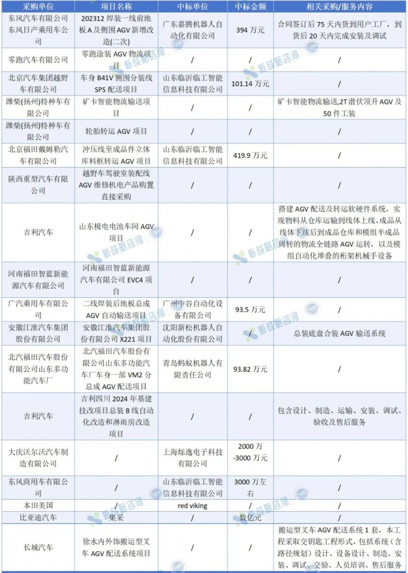 圖表:2024年一季度汽車行業部分AGV及智慧物流相關標訊