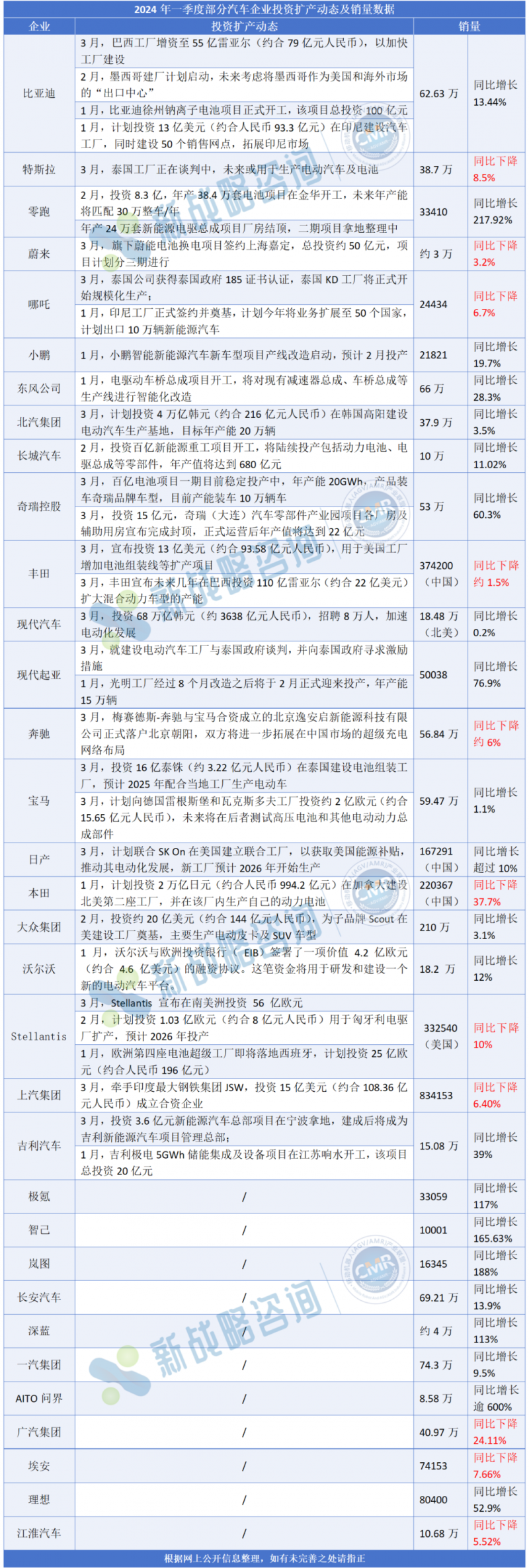圖表:一季度部分汽車企業投資擴產動態及銷量數據