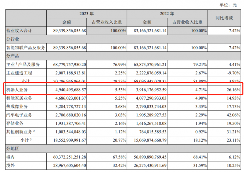 2023年,海康威視創新業務總收入185.53億元,占公司整體收入20.77%。其中,海康機器人業務營收49.4億,同比增長26.16%。