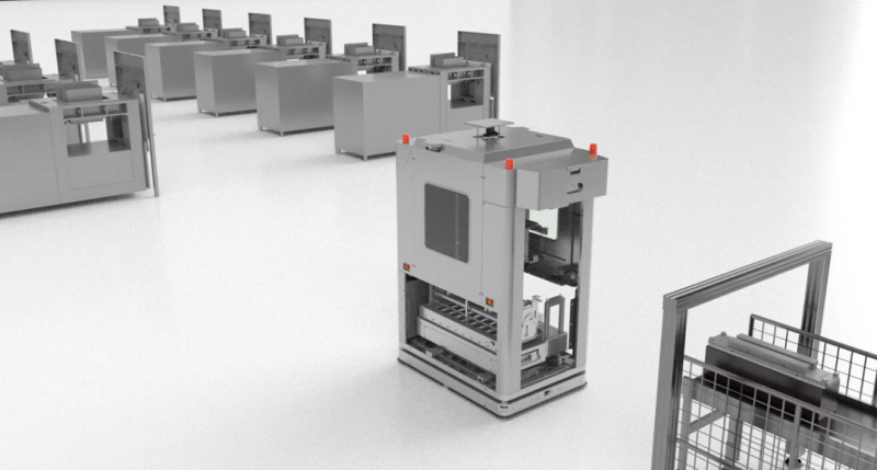 分體式方案則是采用分體式機器人搬運有源貨架與接駁臺對接的方式,再由接駁臺對接產線設備,實現物料的轉運。