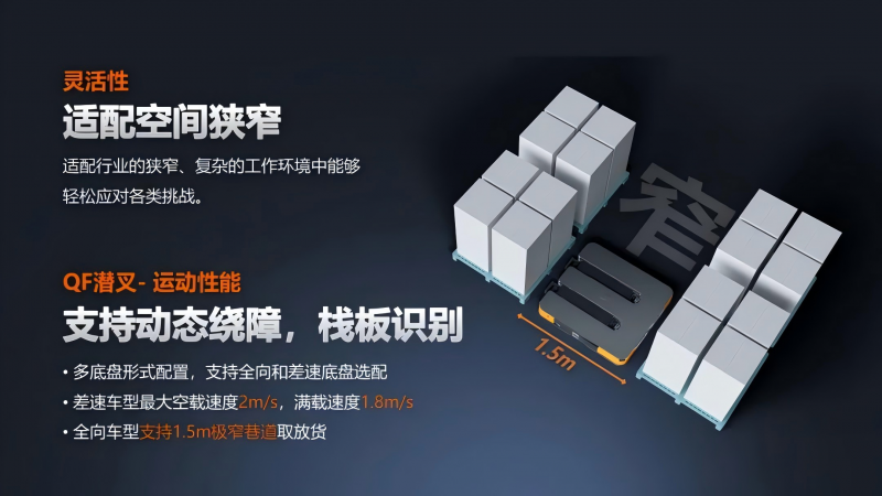 新一代Q1P的空載最高速度達4m/s,加減速性能大幅提升,兩車緊跟隨切換只需2s,揀選時切車換箱基本無感,減少任務切換的耗時浪費。同時無需輸送線,場地適應性和業務擴展柔性更強 。