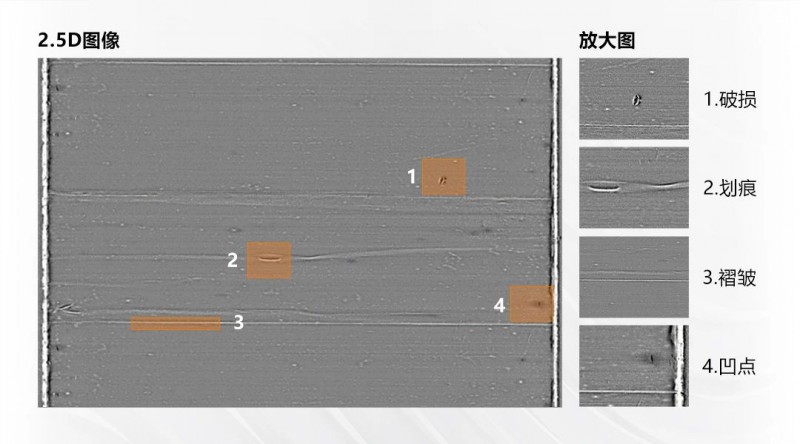 檢測效果:去除覆膜表面顏色和反光影響,有效檢出微小缺陷,對有無高度變化的缺陷進行區分