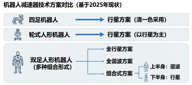 從實際出貨結構來看,不同機器人形態對關節方案的選擇已經出現分化。四足機器人幾乎清一色采用行星方案;輪式人形機器人同樣以行星為主;在雙足人形上,則存在多種組合形式——有的采用行星方案,有的采用諧波方案,有的在上半身使用諧波、下半身使用行星。相比之下,RV減速器由于傳動效率偏低、發熱問題突出,目前并未發現在人形機器人上有成熟的方案。