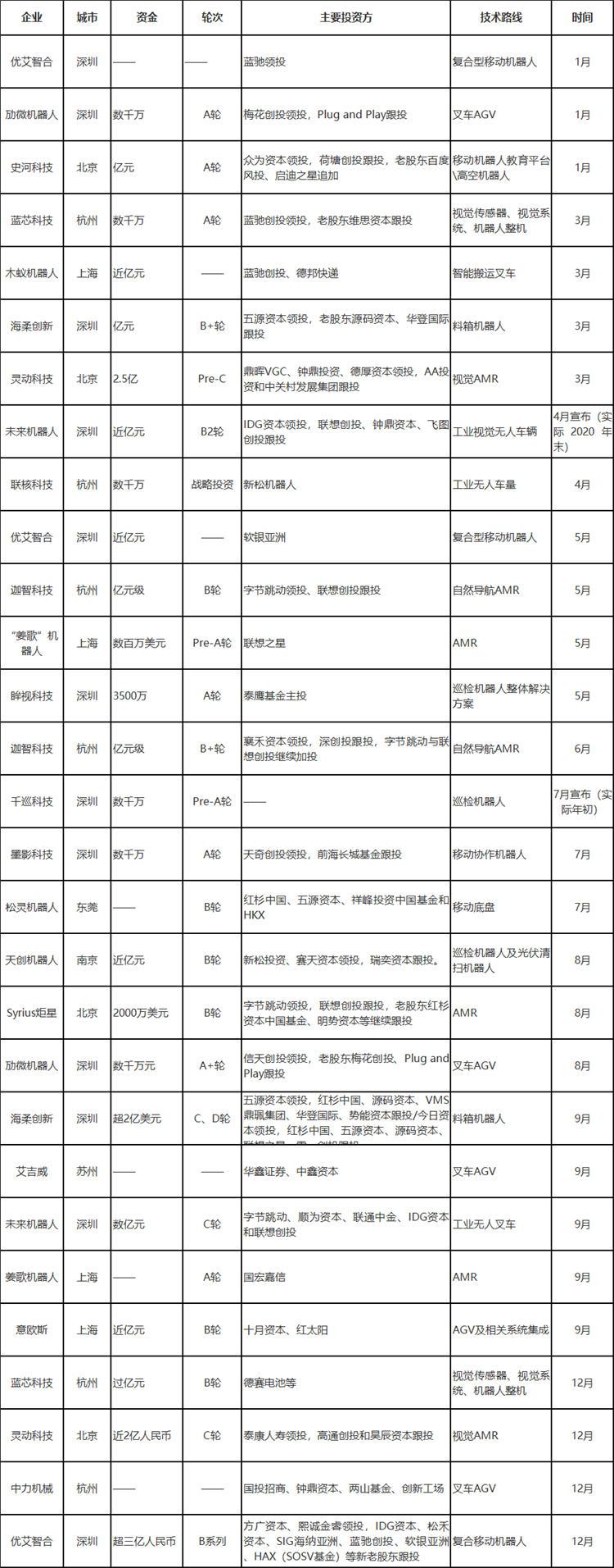 表:2021中國(guó)工業(yè)應(yīng)用移動(dòng)機(jī)器人行業(yè)投融資情況(本表根據(jù)企業(yè)公開(kāi)融資信息統(tǒng)計(jì),如有未完善之處,請(qǐng)指正!)