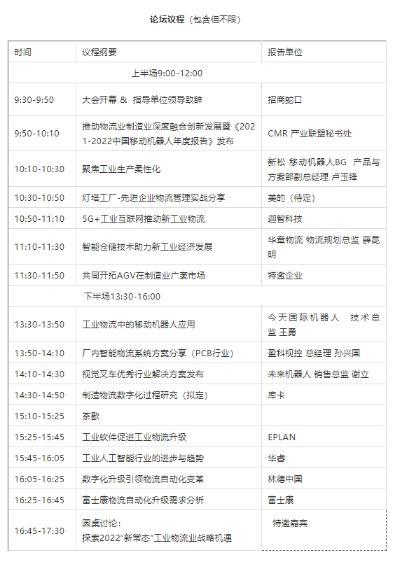 中國•深圳隨著我國社會經濟快速發展,生產要素也在不斷發生變化,人口紅利消退, 土地租金上漲,多重因素迫使 制造業企業加快轉型升級。工廠物流作為生產制造中的關鍵環節,制造型企業物流智能化、數字化轉型的需求日益旺盛。2022年,挑戰與機遇并存,因疫情影響,各種確定與不確定中,全球制造業物流移動機器人市場情況到底如何?未來將朝著什么樣的方向發展,產線物流及倉儲搬運對移動機器人有哪些新要求?4月13日,由中國移動機器人(AGV/AMR)產業聯盟將在深圳舉辦《中國(深圳)工業物流與倉儲智能化發展工程大會暨華南工業應用移動機器人推進大會》。中國移動機器人(AGV/AMR)產業聯盟,致力踐行制造業與物流業雙業融合,推動工業物流高質量發展。上游硬件設備:貨物包裝、智能立體倉庫、AGV自動搬運機器人、AMR自主移動機器人、無人配送機器人、碼垛機器人、RFID自動識別設備、堆垛機、輸送機、分揀機、無人叉車、無人機、智能快遞柜等;中游軟件系統:物流管理信息系統(LMIS)、智能倉庫管理系統(SWMS)、倉庫控制系統(WCS)、集成倉儲管理系統(IWMS)、制造執行系統(MES)等;下游應用行業:醫藥、汽車、新能源、鋰電池、3C、電子、零售、電商、冷鏈等。其他:物流周邊設備及配件、自動化包裝設備及材料、運動控制技術及產品、氣動液壓執行元件、齒輪傳動/減速機、軸承及傳動聯結件、產業園區等