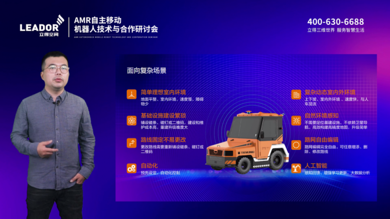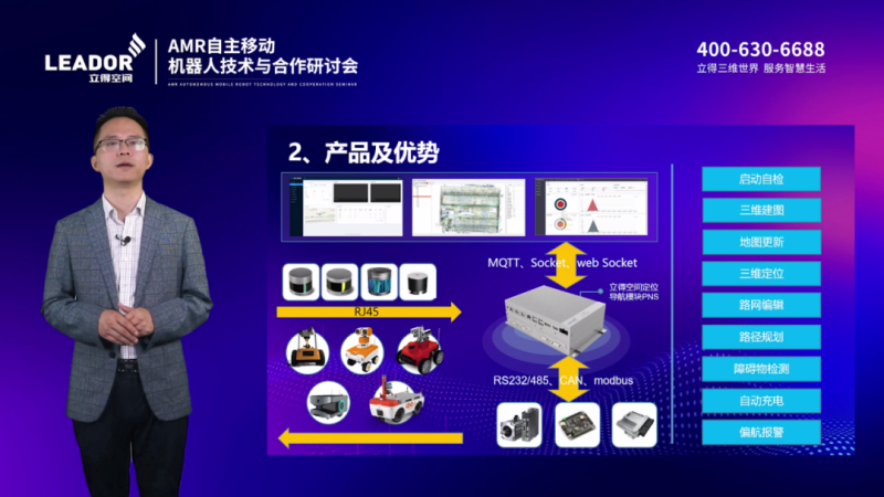 立得空間董事長郭晟在研討會上致辭并發表演講。他介紹說,“立得空間成立23年來基于移動測量、慣性導航、高精地圖、時空大數據等先進技術推動相關產業變革。近年來,立得空間與機器人廠商、OEM生態合作伙伴共同努力,在移動機器人領域獲得了新的突破。通過‘INS(慣性導航系統)+SLAM’算法可以使機器人獲得高精度的定位和導航能力,通過“真圖”數字孿生工廠平臺,對機器人的運行進行模擬仿真,從而使其在實際投用后可以更精準、可靠地完成任務。智能物流、倉儲、安保、應急、特種行業的智能應用相繼落地。”