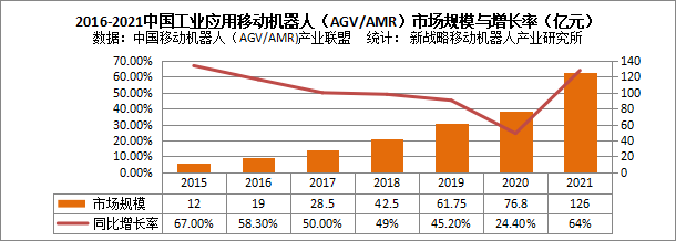 圖表:2015-2021中國市場企業工業應用移動機器人(AGV/AMR)新增量(臺)與增長率